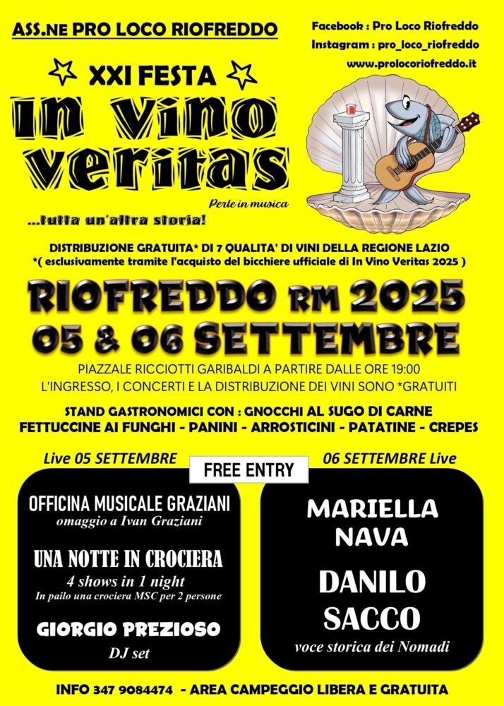 Dalle ore 19:00 Apertura delle botti con la distribuzione gratuita di 7 vini *(il vino potrà essere degustato esclusivamente tramite l’acquisto del bicchiere ufficiale di In Vino Veritas) della regione Lazio (l’ingresso, i concerti e la distribuzione dei vini sono gratuiti) e degli Stand gastronomici.